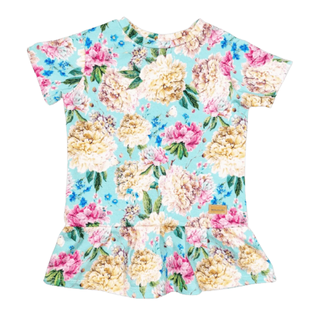 Dětské triko s prodlouženou délkou s volánkama. Kytky na mentolovém podkladu.