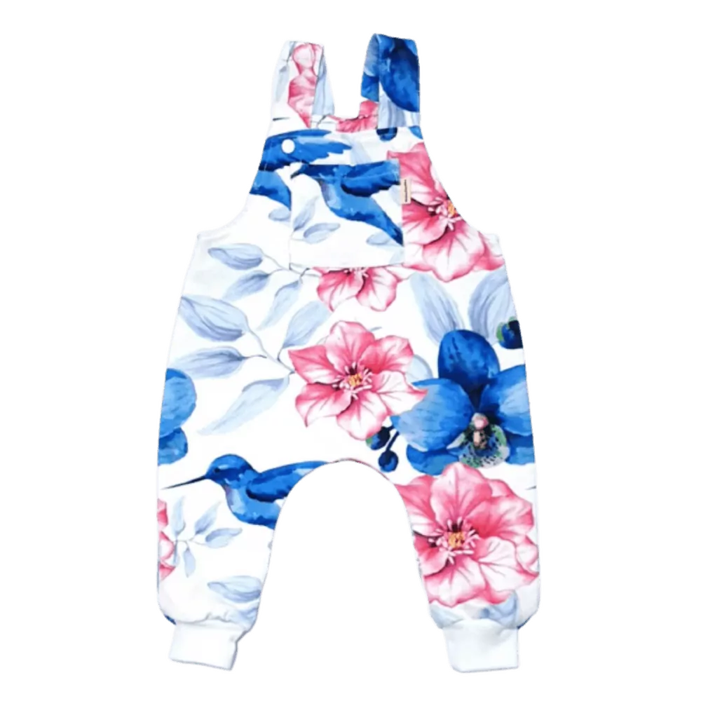 Dlouhé lacláčky s nebesky modrými kolibříky a kytkami na bílém podkladu.