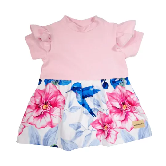 Sukýnkové šatičky s krátkým rukávem a volánkami na ramenou. Nebesky modrý kolibřík s kytičkami na bílém podkladu a světle růžovou kombinací.
