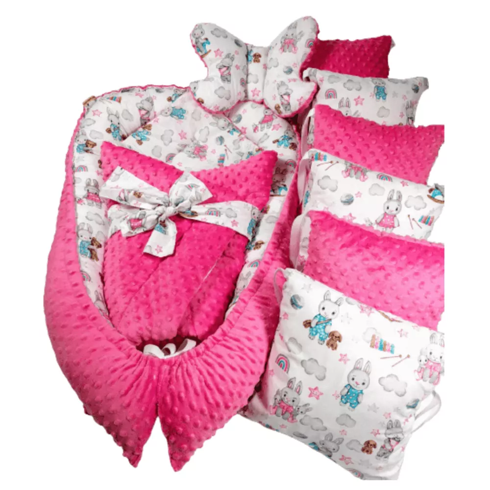 Set do postýlky obsahuje kompletní sadu: hnízdečko, polštářkový mantinel 6ks, zavinovačku a stabilizační polštářek pod hlavičku ve tvaru motýlka.
