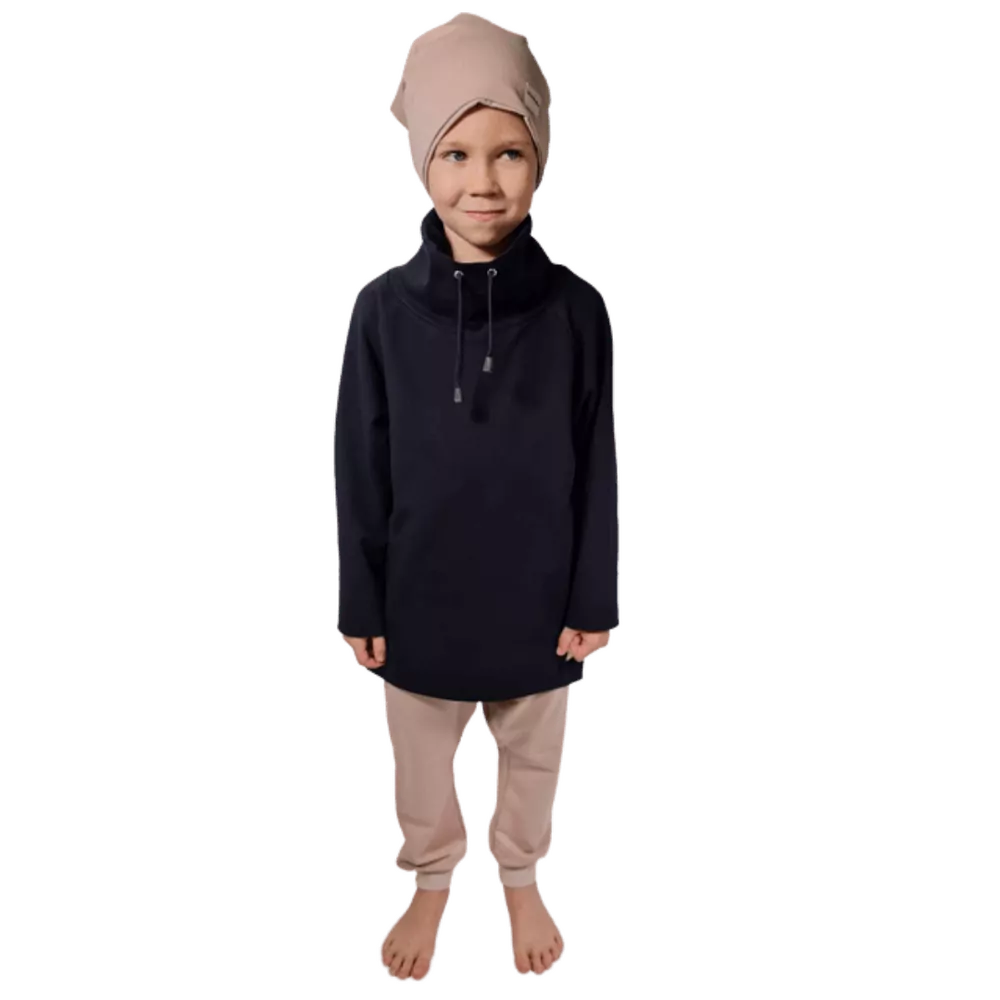 Chlapecká mikina s vysokým krkem se sňůrkami na zavázaní. V přední části vykrojena do tvaru opačného U, vzadu prodloužená délka s rozparkem.