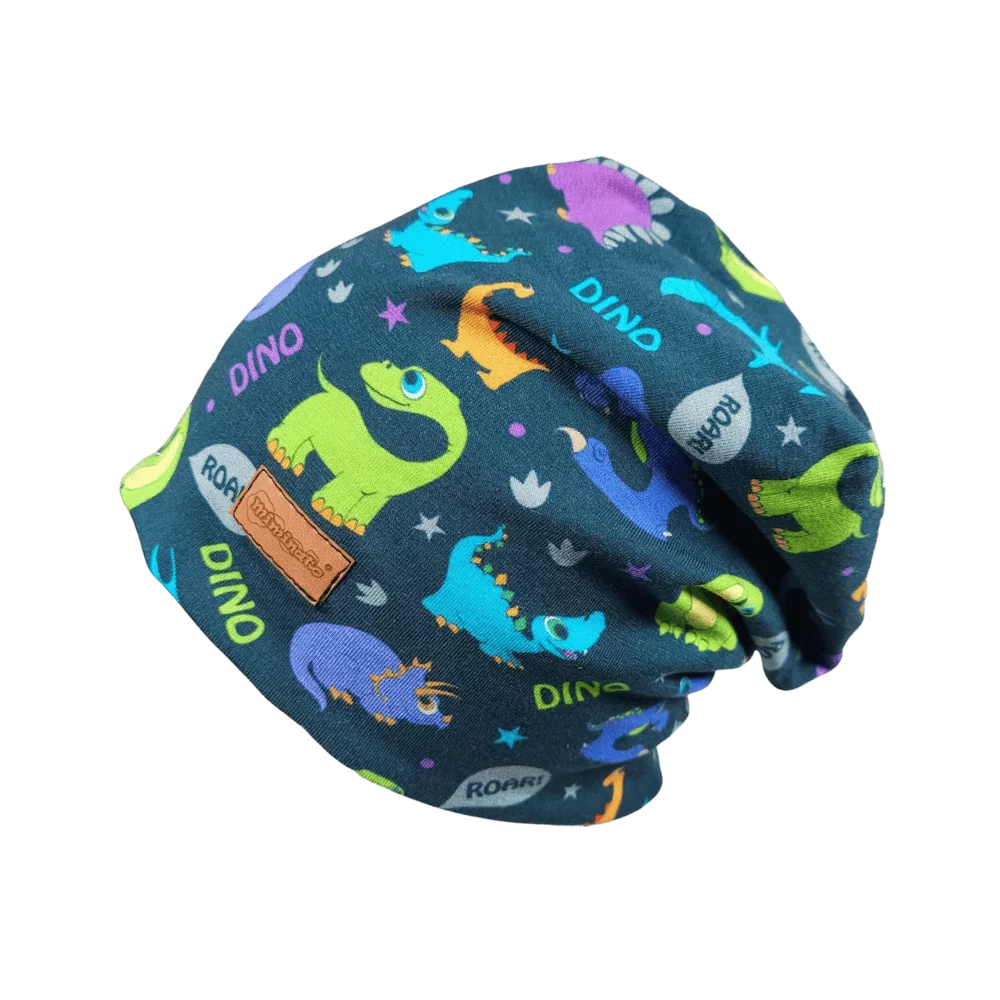 Homeless čepička s barevnými dinosaury na tmavě modrém podkladu. Materiál je pružný, takže čepička určitě vydrží déle.