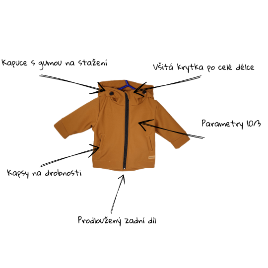 Myslíme na každý detail a hlavně na pohodlí dětí, proto jsme přidali krytku pod bradičku, která je po celé délce zipu, aby nedešlo k podráždění brady. Samozřejmostí je poutko pro pověšení bundy na háček.