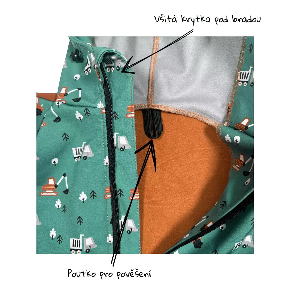 Myslíme na každý detail a hlavně na pohodlí dětí, proto jsme přidali krytku pod bradičku, která je po celé délce zipu, aby nedešlo k podráždění brady. Samozřejmostí je poutko pro pověšení bundy na háček.
