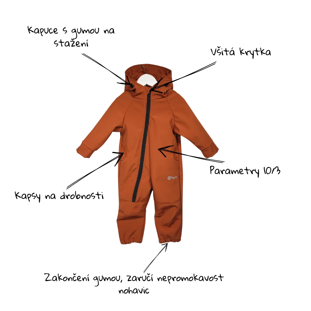 Dětská softshellová kombinéza se dokonale hodí do podzimního počasí, díky skvělým vlastnostem softshellu, který neprofoukne, nepromokne při menším dešti a je prodyšný.