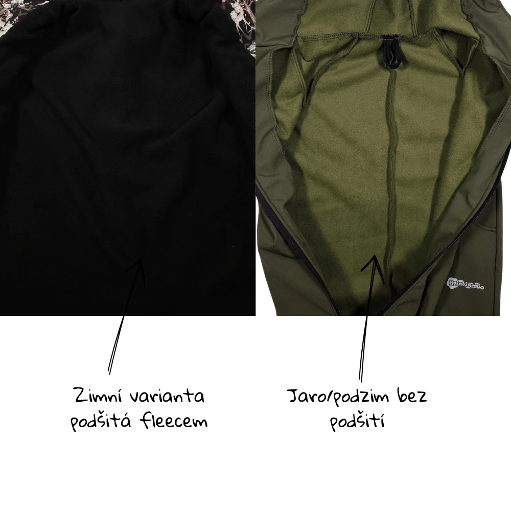 Kombinézy šijeme ve dvou variantách, klasicky ze zimního softshellu, který má z rubu tenčí vrstvu fleecu a je vhodná do podzimního/jarního počasí, nebo s podšitím další vrstvy fleecu, kde je bunda vhodná do chladnějšího zimního počasí.
