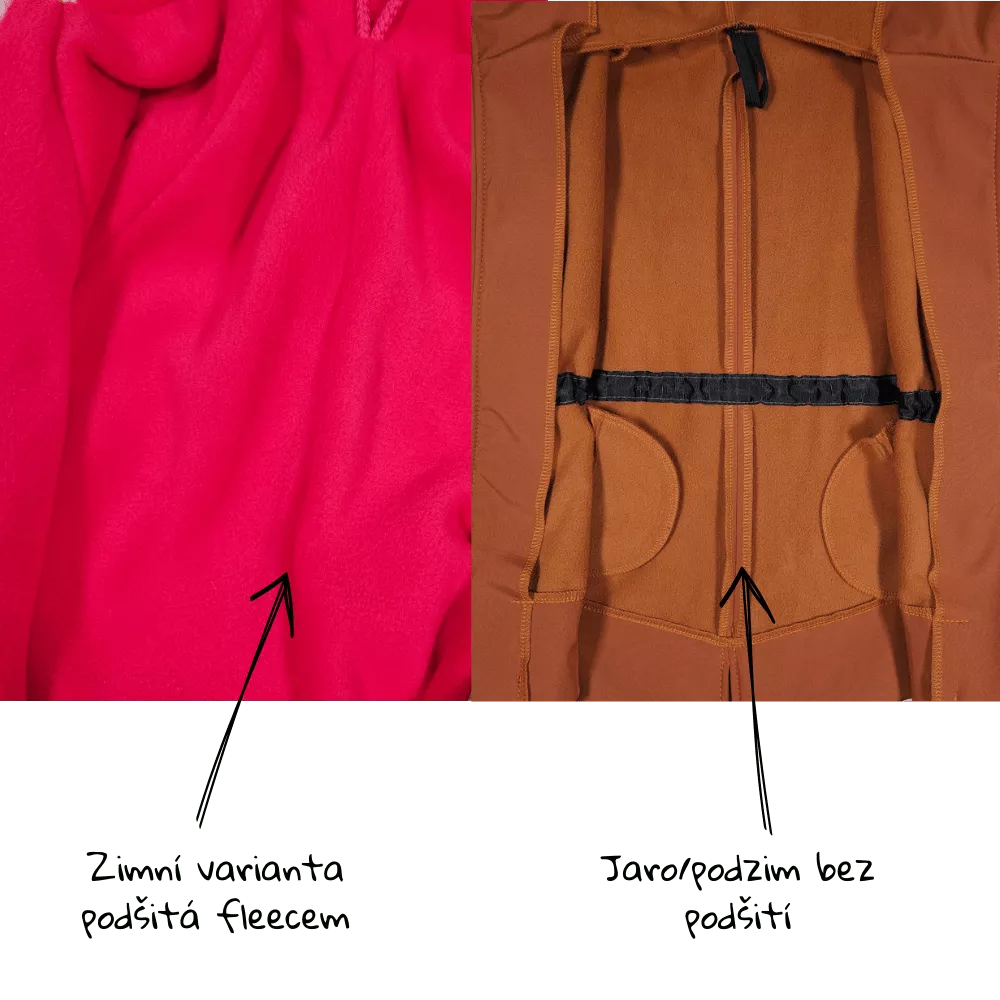 Parky šijeme ve dvou variantách, klasicky ze zimního softshellu, který má z rubu tenčí vrstvu fleecu a je vhodná do podzimního a jarního počasí, nebo s podšitím další vrstvy fleecu, kde je bunda vhodná do chladnějšího zimního počasí.