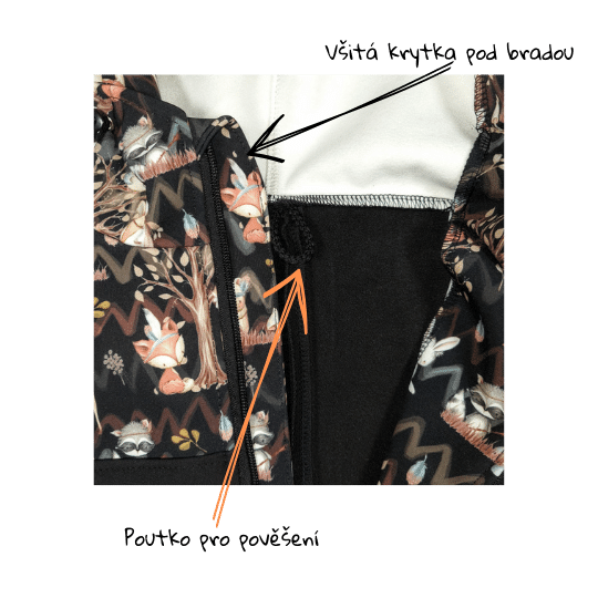 Myslíme na každý detail a hlavně na pohodlí dětí, proto jsme přidali krytku pod bradičku, která je po celé délce zipu, aby nedešlo k podráždění brady. Samozřejmostí je poutko pro pověšení parky na háček.