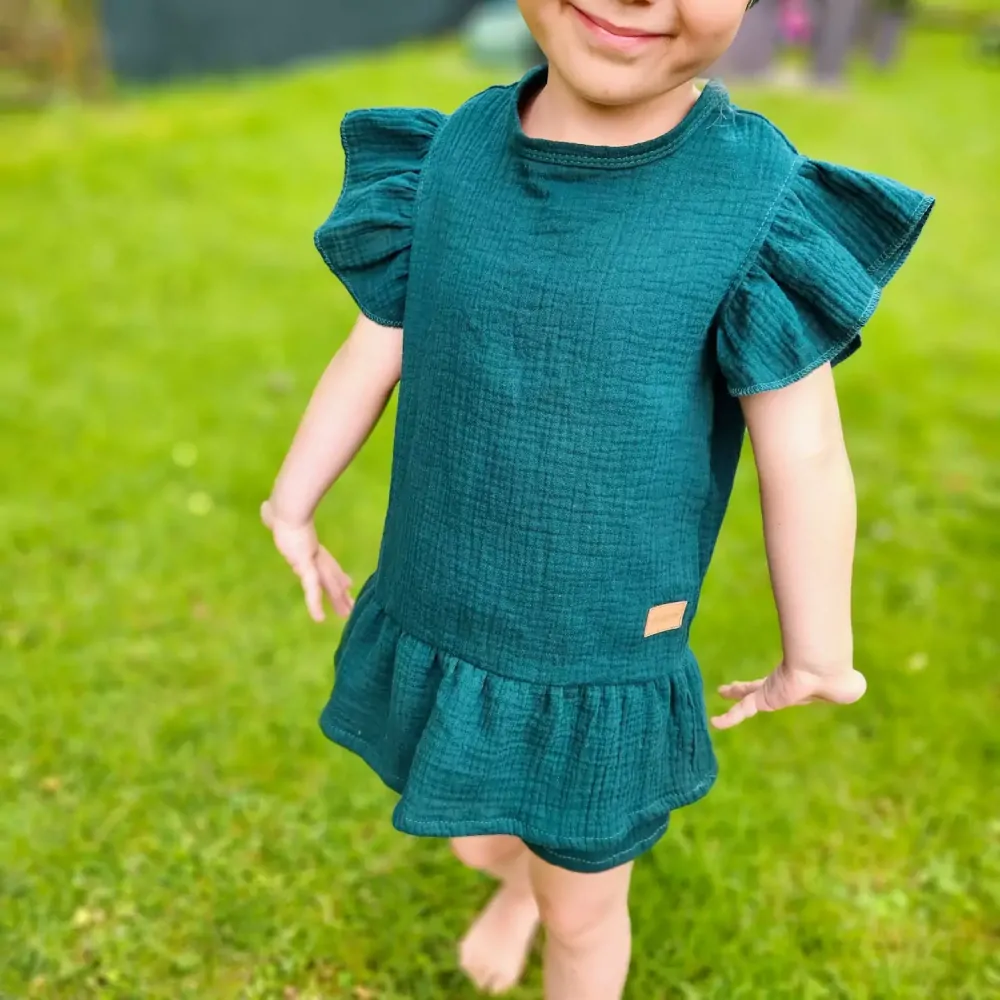Dětské mušelínové triko s volánky na ramenou - petrolejová zelená