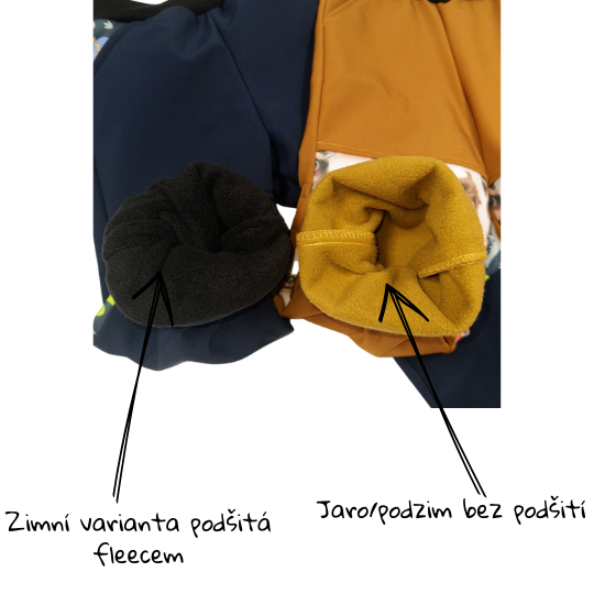 Kalhoty šijeme ve dvou variantách, klasicky ze zimního softshellu, který má z rubu tenčí vrstvu fleecu a je vhodný do jarního/podzimního počasí, nebo s podšitím další vrstvy fleecu, kde jsou kalhoty vhodné do zimního počasí a jsou hrubé jako oteplováky, takže vaše děti můžou hezky v teploučku řádit na snížku a nebude jim zima :-)