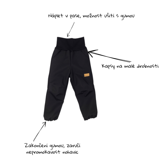 Softshellové kalhoty šijeme s kapsami pro uchování malých drobností, které Vaše ratolesti rádi venku sbírají.