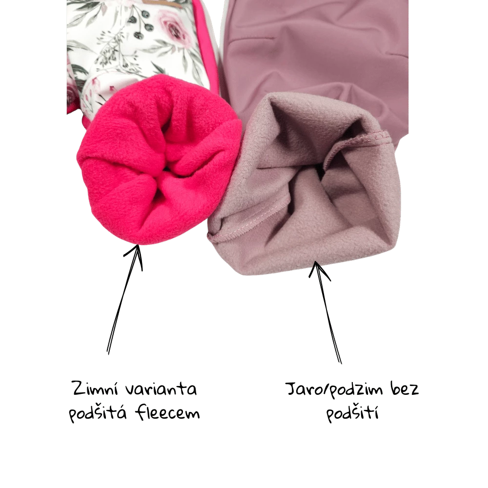 Kalhoty šijeme ve dvou variantách, klasicky ze zimního softshellu, který má z rubu tenčí vrstvu fleecu a je vhodný do jarního/podzimního počasí, nebo s podšitím další vrstvy fleecu, kde jsou kalhoty vhodné do zimního počasí a jsou hrubé jako oteplováky, takže vaše děti můžou hezky v teploučku řádit na snížku a nebude jim zima :-)