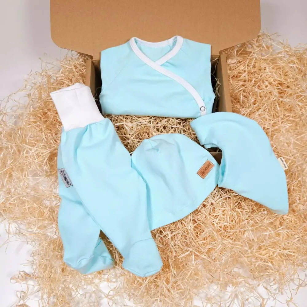 Kojenecký setík obsahuje: polodupačky, zavinovací bodyčko s dlouhým rukávem, jednovrstvou čepičku a slintáček.
